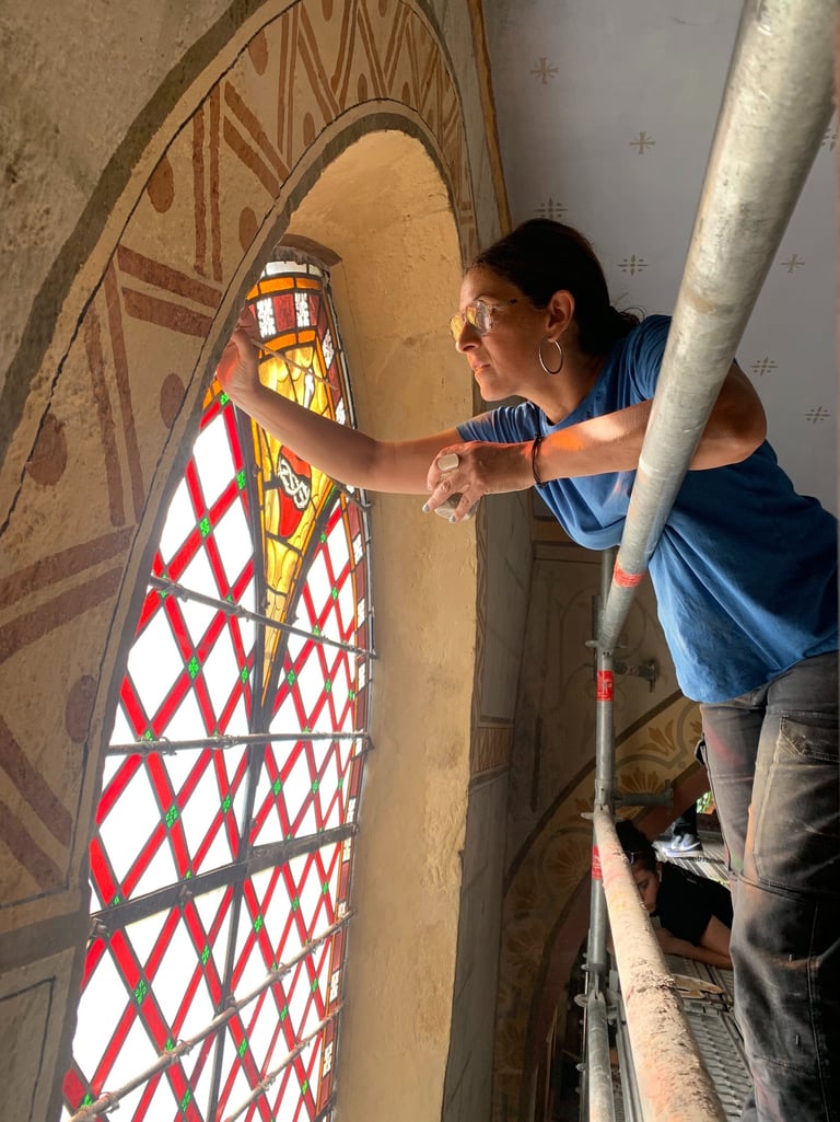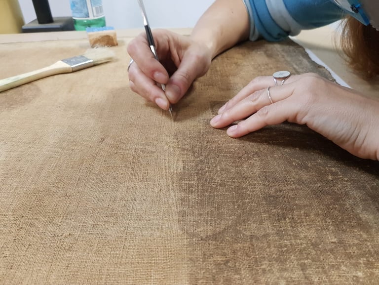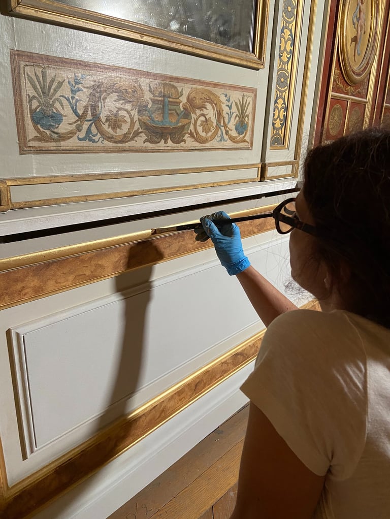Après plus de quinze années passées comme peintre décoratrice dans l’univers du spectacle, j’ai réalisé à quel point ce parcours avait affûté mon regard et éveillé le sens du détail. J’ai cependant enrichi mon savoir-faire grâce à d’autres formations, et plus en particulier, dans l’étude approfondie de la couleur : contretypages, recherches chromatiques, création de nuanciers. La restauration s’est imposée naturellement comme la continuité de mon parcours. Trois années de formation spécialisée à Paris m’ont menée, en 2024, à l’obtention du diplôme de restauratrice de tableaux et d’objets d’art polychromes (ATP formation -RNCP niveau 6).