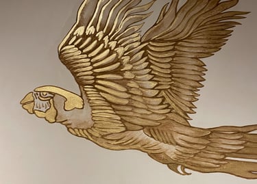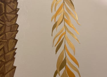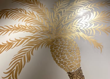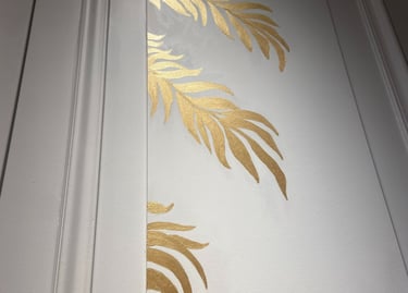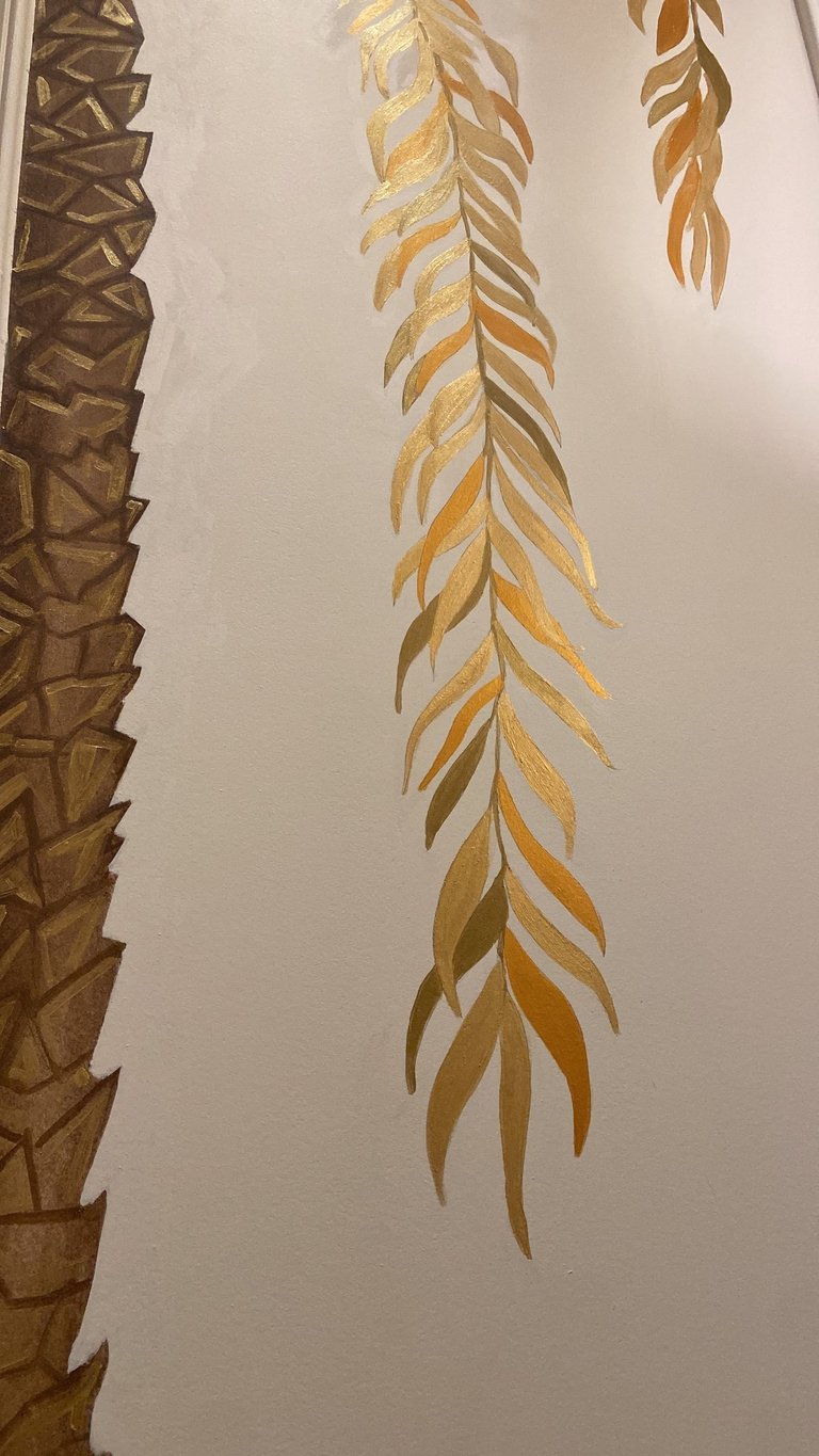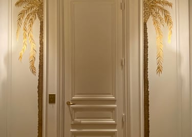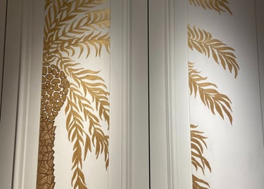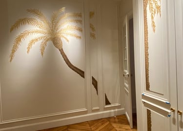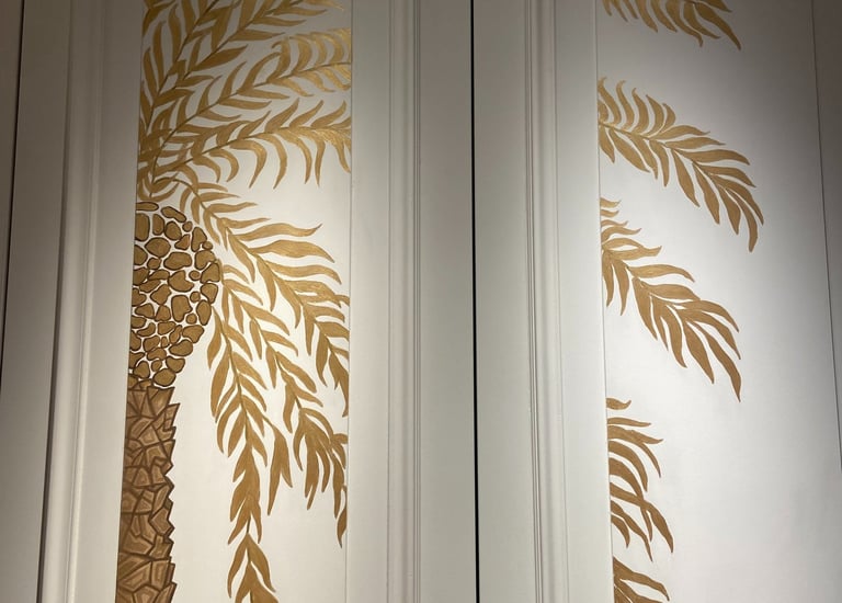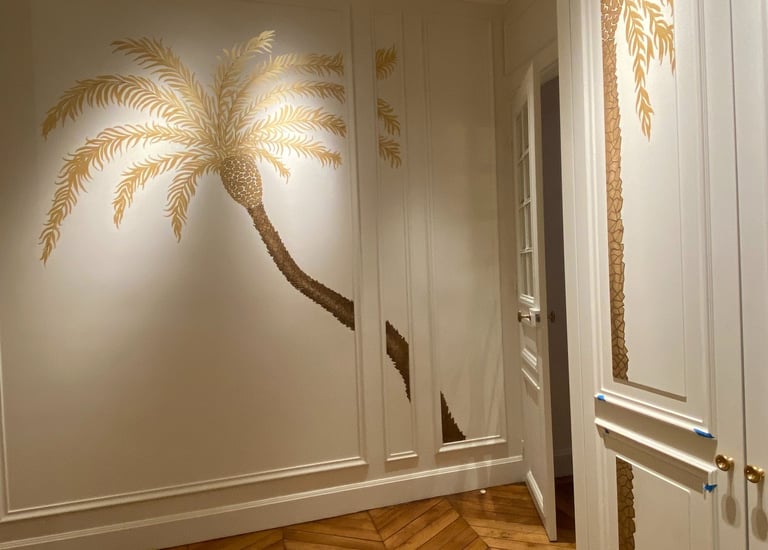 Création d’un décor sur murs et placards sur le thème du palmier, peint à l’acrylique et réalisé dans un intérieur de style haussmannien.